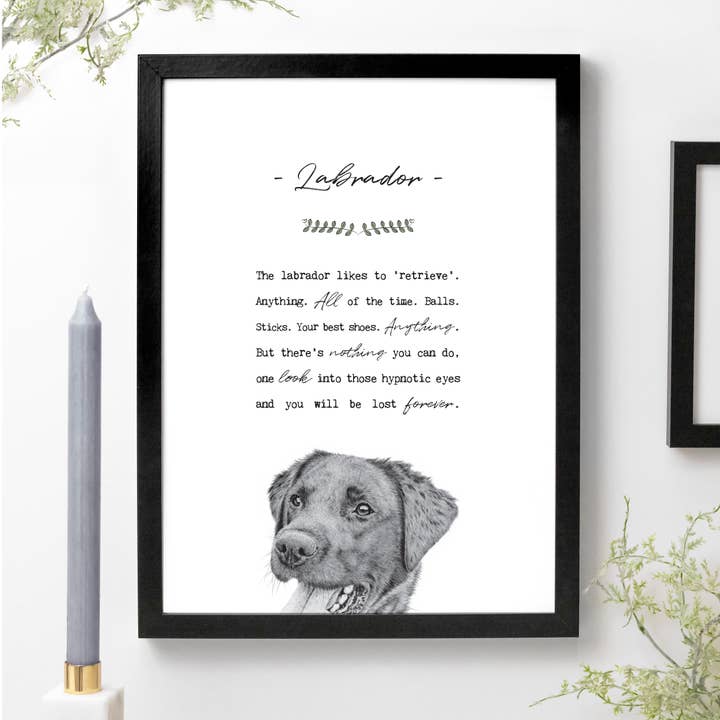 Printed on heavyweight textured white paper. Designed to fit off-the-shelf frames (frame is not included). Packaged with recycled grey board. From Coulson Macleod's 'Pooch' product range.